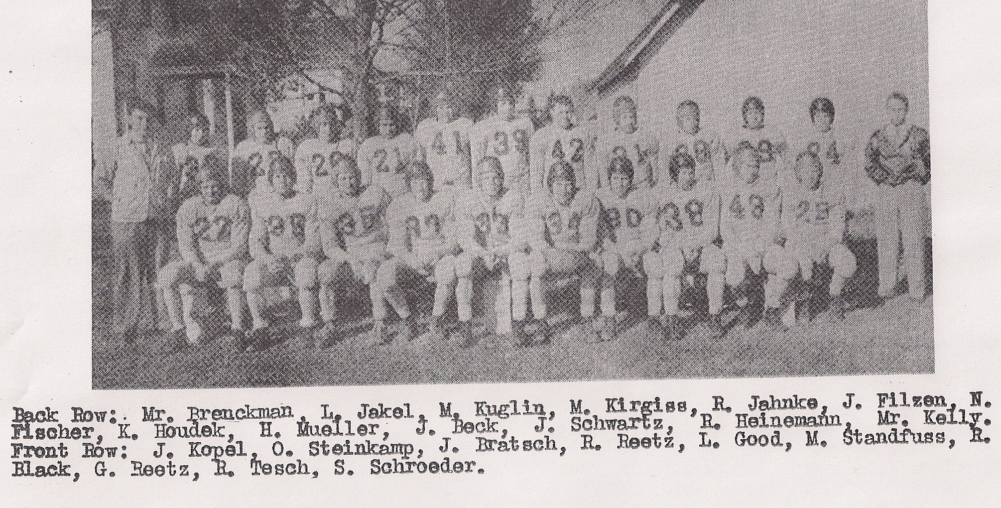 In the first year of Eight Man Football, the 1951 Danube Hawks went undefeated for the season with a 6-0 record and stretched their winning streak to 21 games. Danube's winning streak began on the season finale of 1948 with a 19-13 win over Bird Island. In 1949 the Hawks won six games and tied one (Stewart 12-12), and in 1950 they went 7-0. The 1951 Hawks led the conference in scoring with a 44.4 scoring average offense and gave up 8.5 points per game on defense. Runner-up Hector averaged 36.1 points on offense and gave up 9.1 points per game on defense. Danube beat Hector, 13-12, in a come from behind mid-season game. Danube was led by All-State halfback, Marvin Standfuss. The 5’11, 190 pound fullback was legendary for hard hitting and aggressive play. Senior quarterback, Rod Black, and halfback, Shorty Schroeder were other All-Conference backs on the team. Outstanding linemen on the team were sophomores, Larry Good and Red Reetz, and seniors Orrel Steinkamp, and John Bratsch. In the era of six and eight man football, the 1951 Danube Hawks were said to be best team of that time. In 1950 and 1951, they were held under 20 points only twice. Both times were against Hector in hard fought 15-12 and 13-12 wins. In an unusual situation, Danube Fullback, Marvin Standfuss was left off of the all conference list, but made the All State team. Standfuss scored 15 touchdowns and 10 extra points in his senior year. Conference coaches felt that Standfuss was “over aggressive” and did not meet the standards of an All Conference player. Some of the coaches even accused Danube Coach, R.M. Brenckman, of teaching “dirty” football. Danube officials vehemently denied any accusations against Brenckman and Standfuss. Danube Superintendant, K.B. Knutston, stated that Brenckman was a model teacher and coach, and Standfuss never was a discipline problem in school.